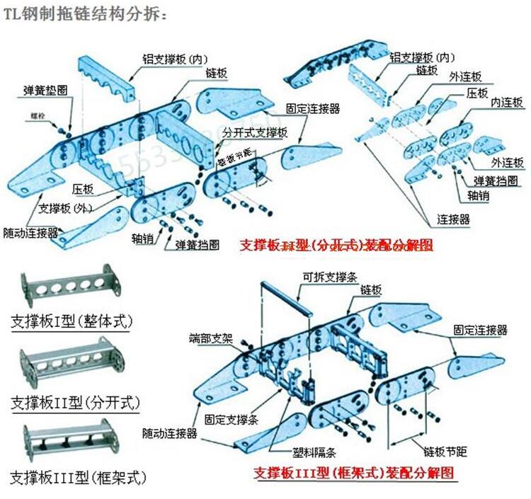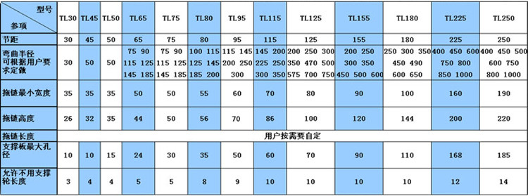 鋼制拖鏈有TL45、TL65、TL95、TL125、TL180、TL225、TL250型,彎曲半徑范圍為50-800。拖鏈的寬度可按客戶實際需求定做,鋼制拖鏈包含三種支撐板形式: