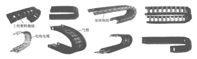 在數(shù)控機床等自動化生產(chǎn)設(shè)備中,對于一直往復(fù)運動的工作臺或部件,為了將電線電纜、壓縮空氣的氣管、液壓油管從固定的控制柜接到工作臺上,使用拖鏈可以保護這些運動的管線.將經(jīng)常運動的管線放入拖鏈中,并固定在拖鏈上,拖鏈的一端固定在運動平臺上,拖鏈的另一端固定在不動的機器機架上,這樣在平臺運動時,拖鏈中的管線可以防止硬性彎曲,同時也可以對管線進行保護。